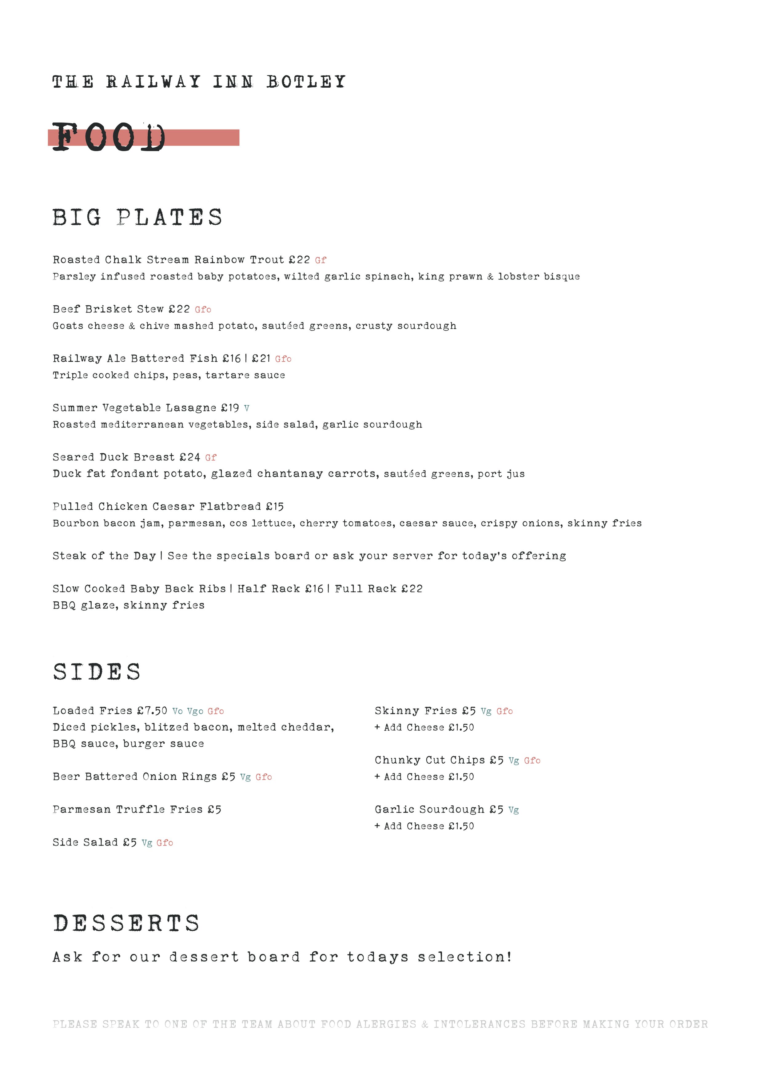 Our desserts change on a regular basis. See our dessert board in the pub for what's on offer today!